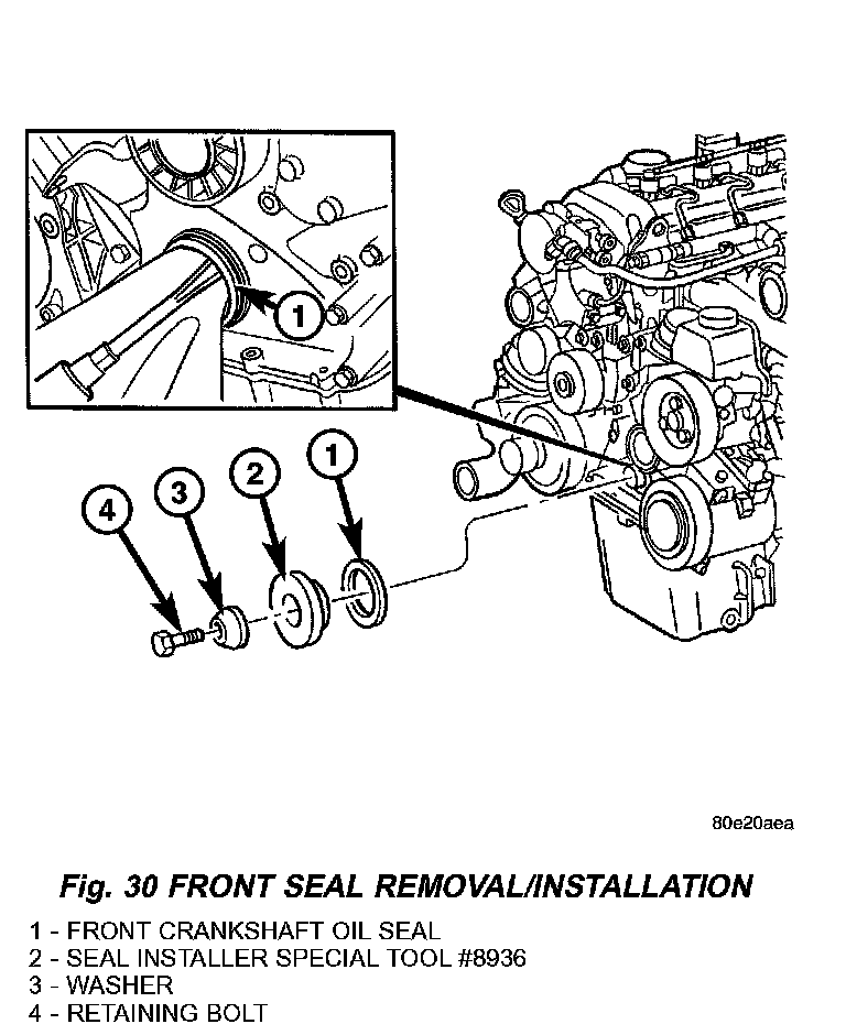 5. Using a suitable prying tool, remove the front crankshaft seal from the timing cover (Fig. 30).