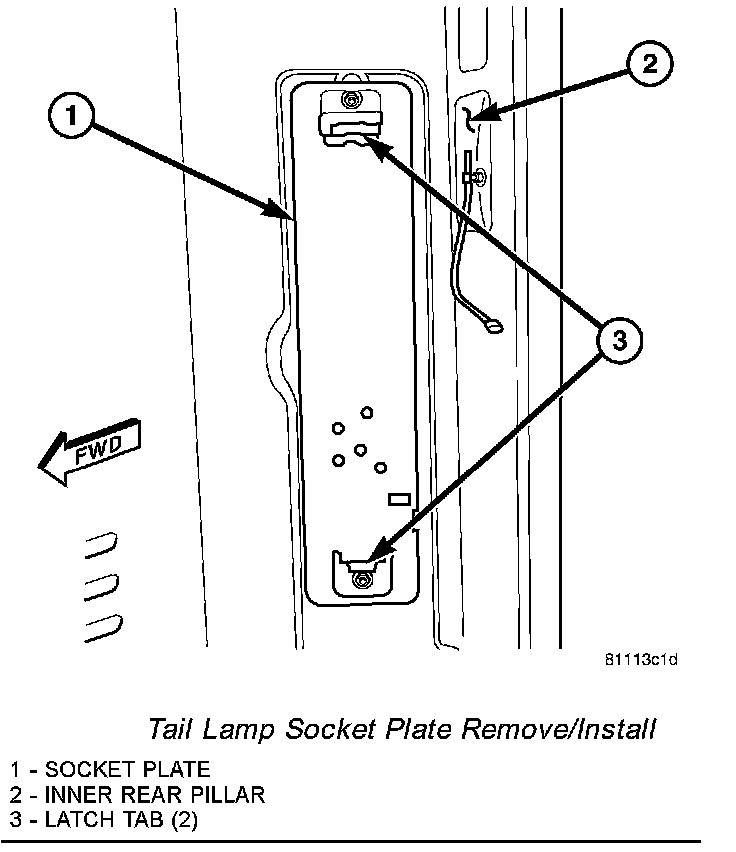 3. From inside the vehicle, use hand pressure to push the two latch tabs toward the center of the tail lamp unit socket plate and pull the socket plate straight out from the inner rear pillar.