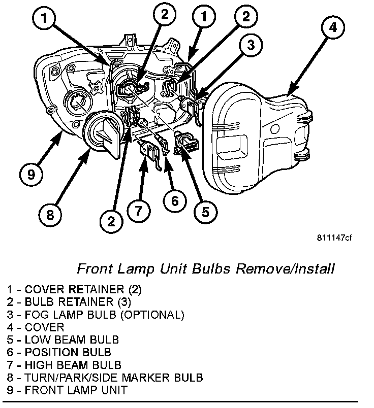 2. Disengage and swing the retainers that secure the front lamp unit rear cover to each side of the lamp housing and remove the cover.
