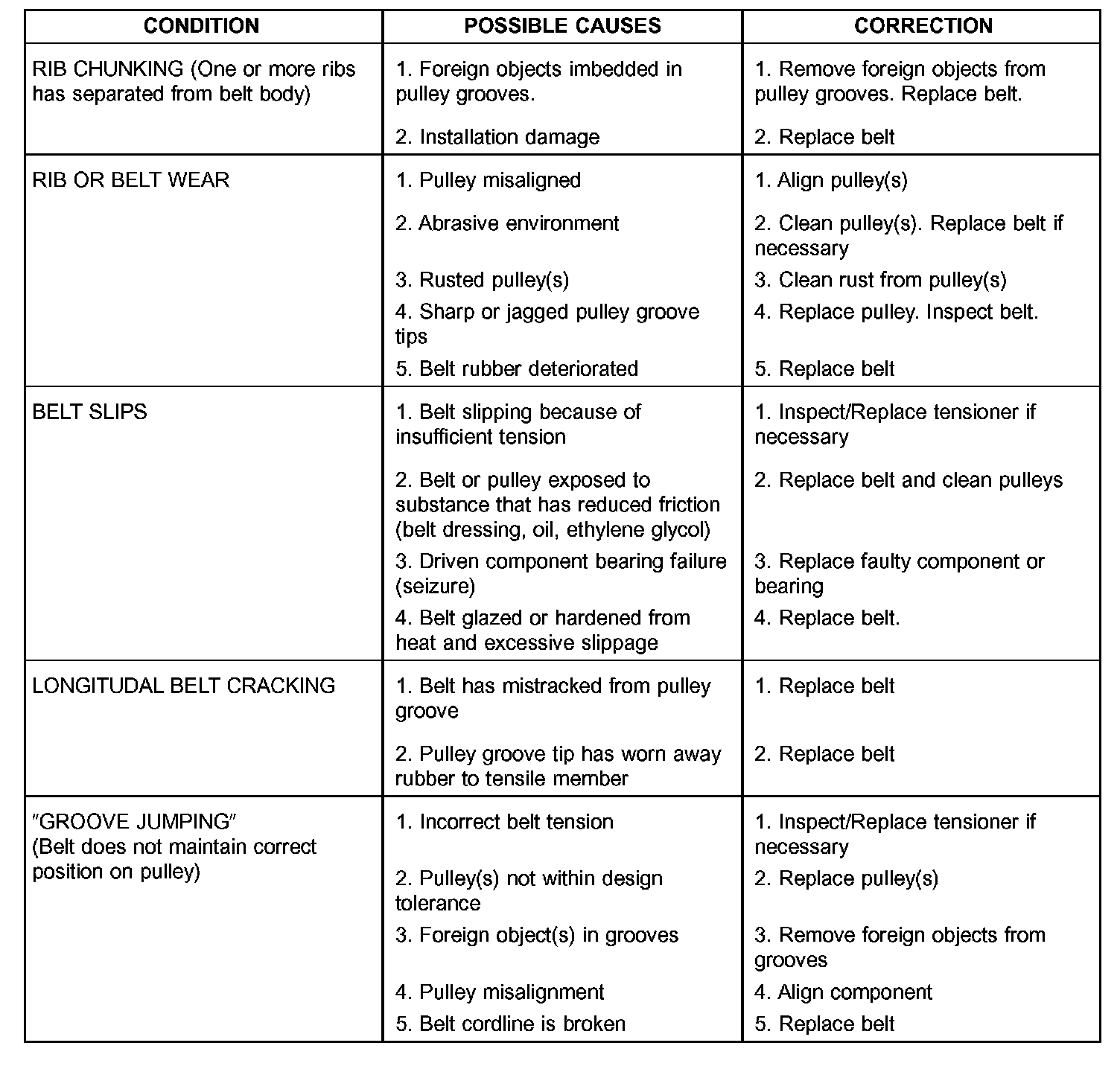 When diagnosing serpentine accessory drive belts, small cracks that run across the ribbed surface of the belt from rib to rib (Fig. 1), are considered normal. These are not a reason to replace the belt. However, cracks running along a rib (not across) are not normal. Any belt with cracks running along a rib must be replaced (Fig. 1). Also replace the belt if it has excessive wear, frayed cords or severe glazing.