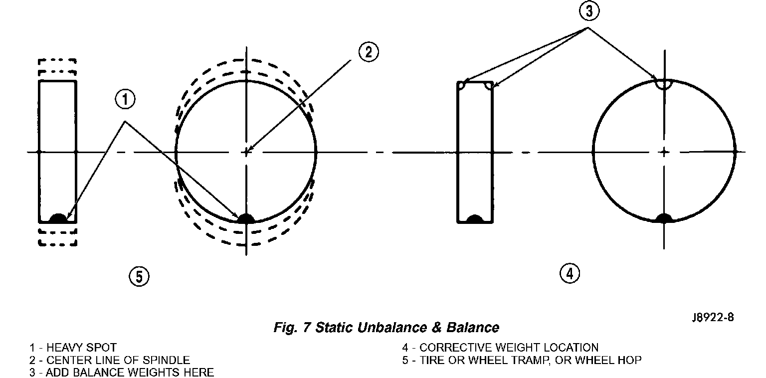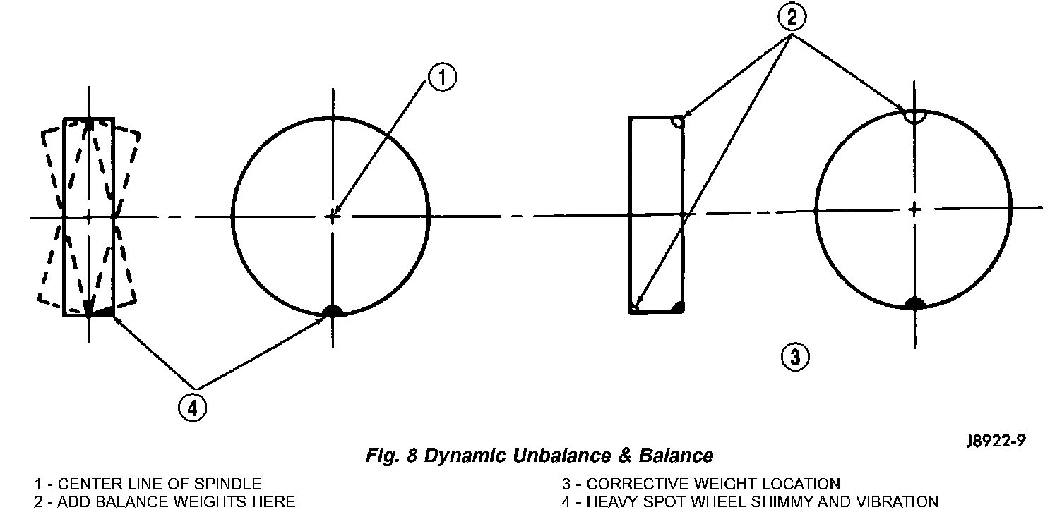 For static balancing, find the location of the heavy spot causing the imbalance. Counter balance wheel directly opposite the heavy spot. Determine weight required to counter balance the area of imbalance. Place half of this weight on the inner rim flange and the other half on the outer rim flange (Fig. 7).
