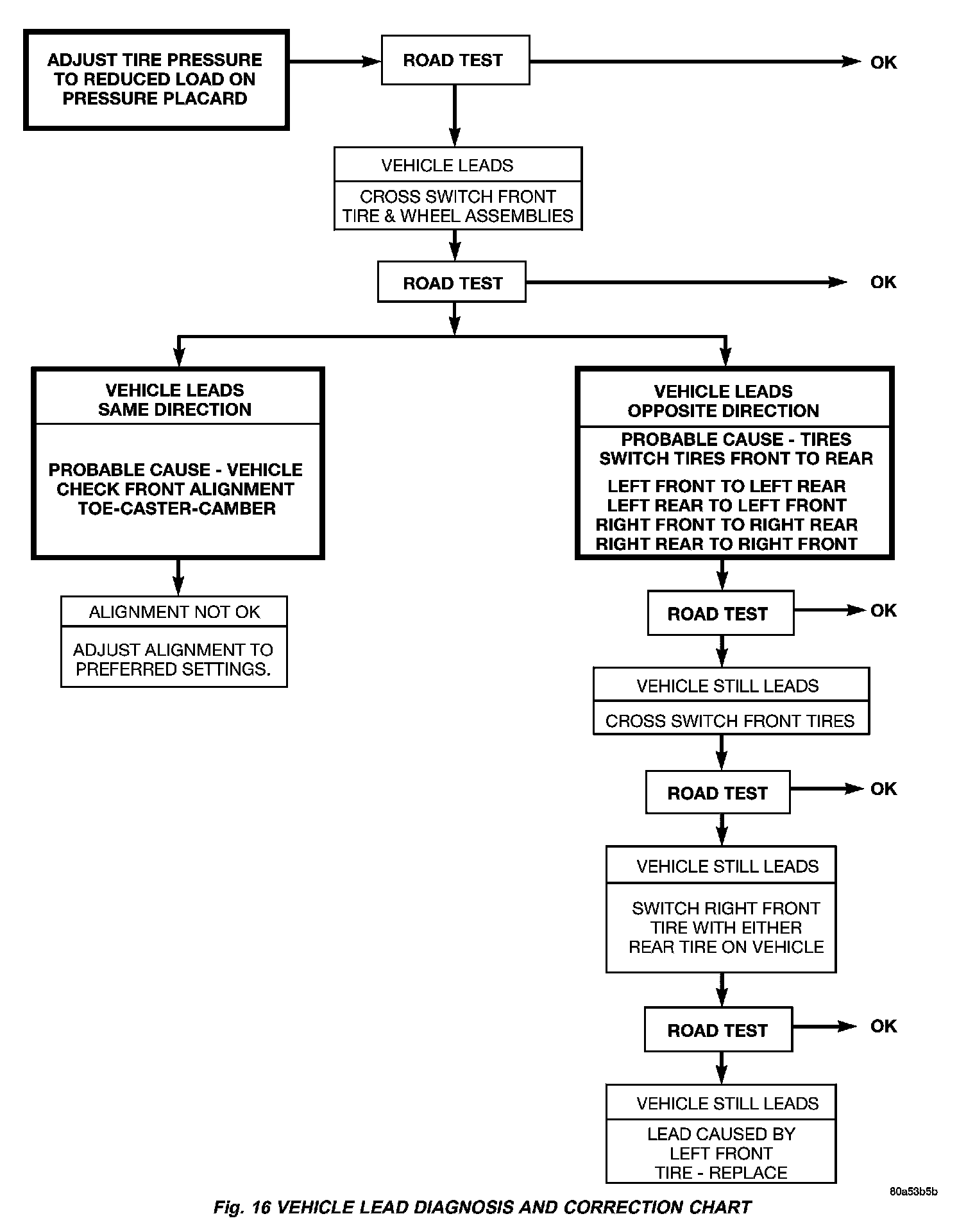 Use the following Vehicle Lead Diagnosis And Correction Chart to diagnose and correct a vehicle lead or drift problem (Fig. 16).