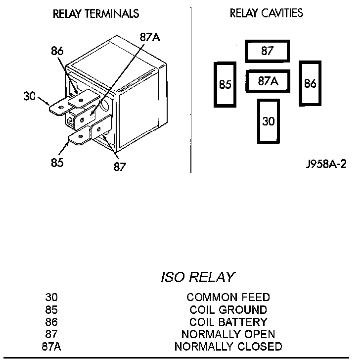 The ISO relay consists of an electromagnetic coil, a resistor and three (two fixed and one movable) electrical contacts. The movable (common feed) relay contact is held against one of the fixed contacts (normally closed) by spring pressure. When the electromagnetic coil is energized, it draws the movable contact away from the normally closed fixed contact, and holds it against the other (normally open) fixed contact.