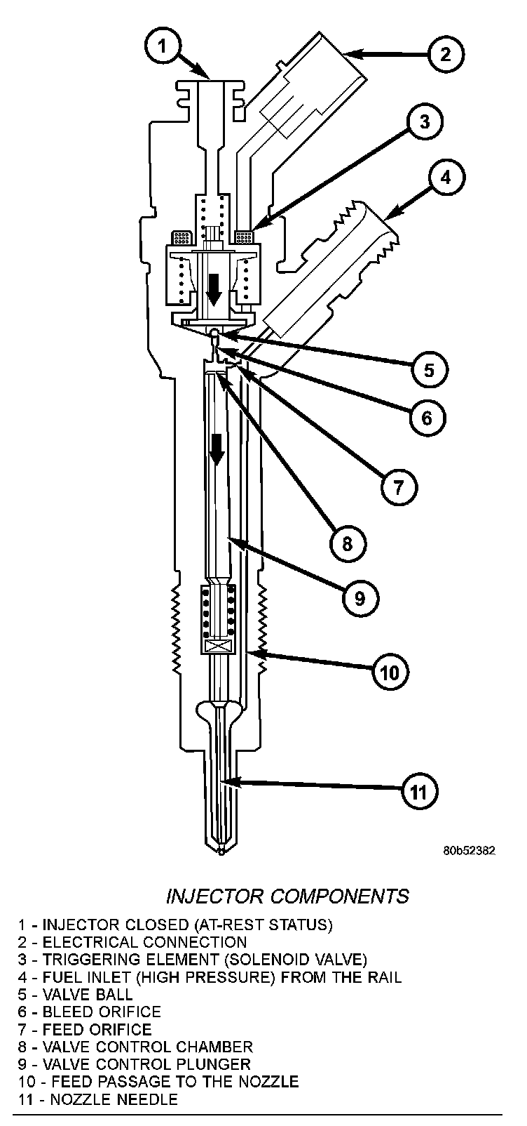 With the injector closed (at-rest state), the solenoid valve is not energized and is therefore closed. With the bleed orifice closed, the valve spring forces the armatures ball onto the bleed-orifice seat. The rail's high pressure build up in the valve control chamber, and the same pressure is also present in the nozzle's chamber volume. The rail pressure applied at the control plunger's end face, together with the force of the nozzle spring, maintain the nozzle in the closed position against the opening forces applied to its pressure stage.