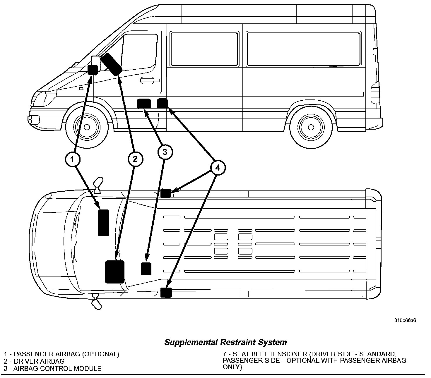A Next Generation driver airbag is standard factory-installed safety equipment on this model, while a passenger side front airbag is optional. This airbag system is a passive, inflatable, Supplemental Restraint System (SRS) and vehicles with this equipment can be readily identified by the "SRS - AIR-BAG" logo molded into the driver airbag trim cover in the center of the steering wheel and, if the vehicle is so equipped, also into the passenger airbag door on the instrument panel above the glove box. Vehicles with the airbag system can also be identified by the airbag indicator, which will illuminate in the instrument cluster for about six seconds as a bulb test each time the ignition switch is turned to the On position. A pyrotechnic-type seat belt tensioner is integral to the front seat belt retractor mounted on the lower B-pillar on the driver side, and to the passenger side retractor of vehicles equipped with the optional passenger side airbag.