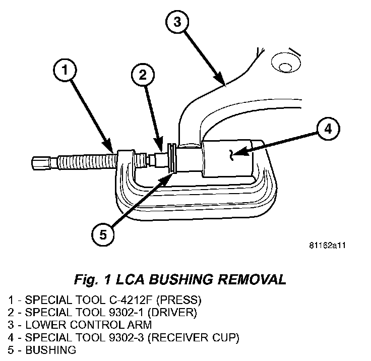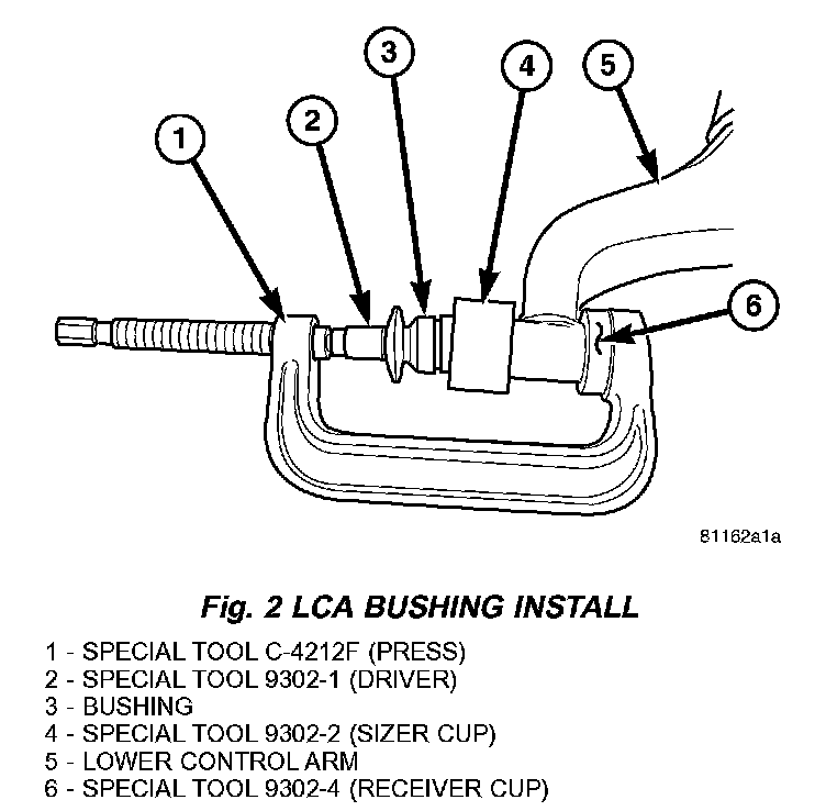 2. Press the new bushing into the control arm using special tool C-4212F and 9302-1 (Driver) with 9302-2 (Sizer cup) and 9302-4 (Receiver) (Fig. 2).