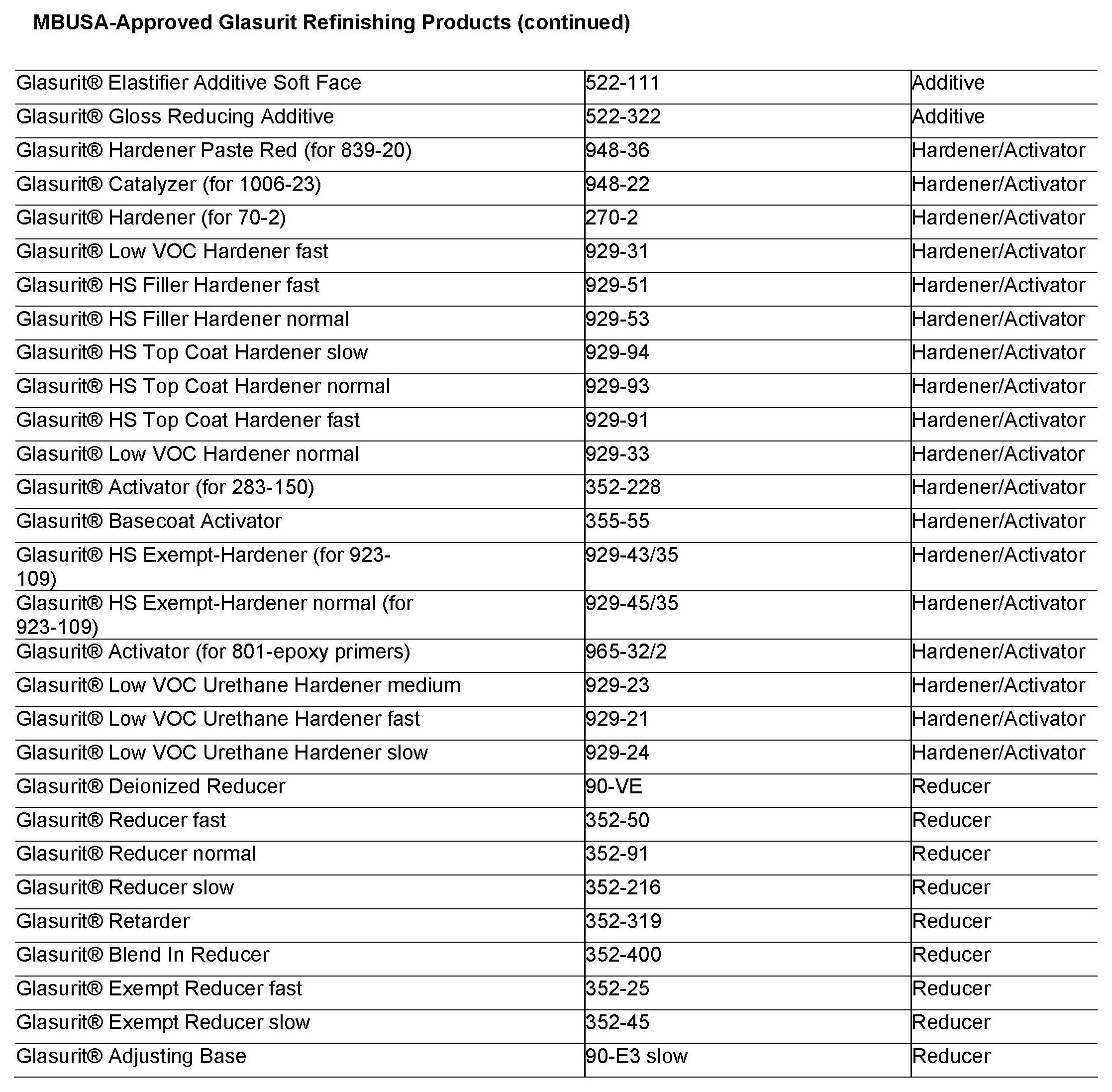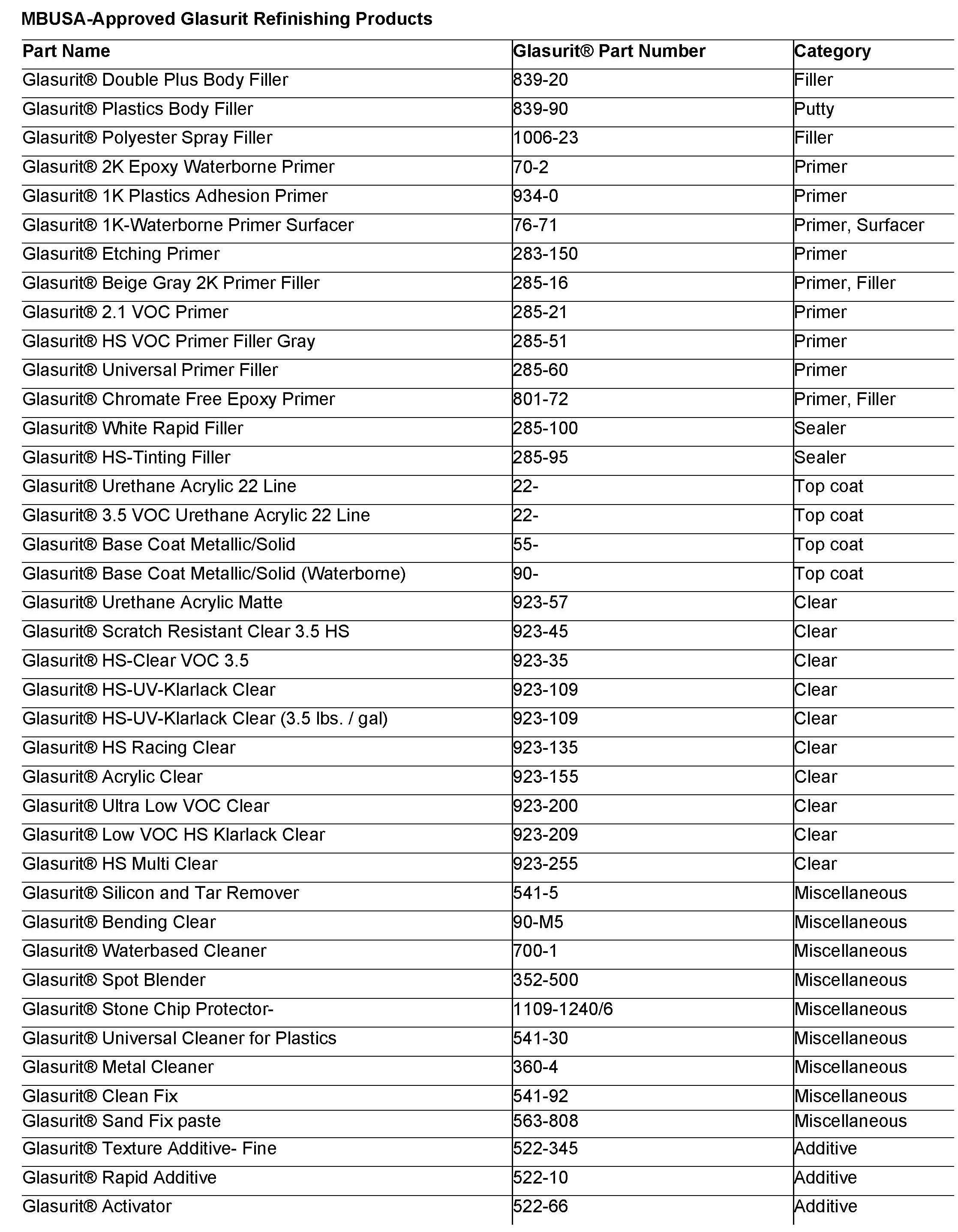 MBUSA approved refinishing products from Glasurit, R-M, Spies Hecker, Standox, and Global are listed.