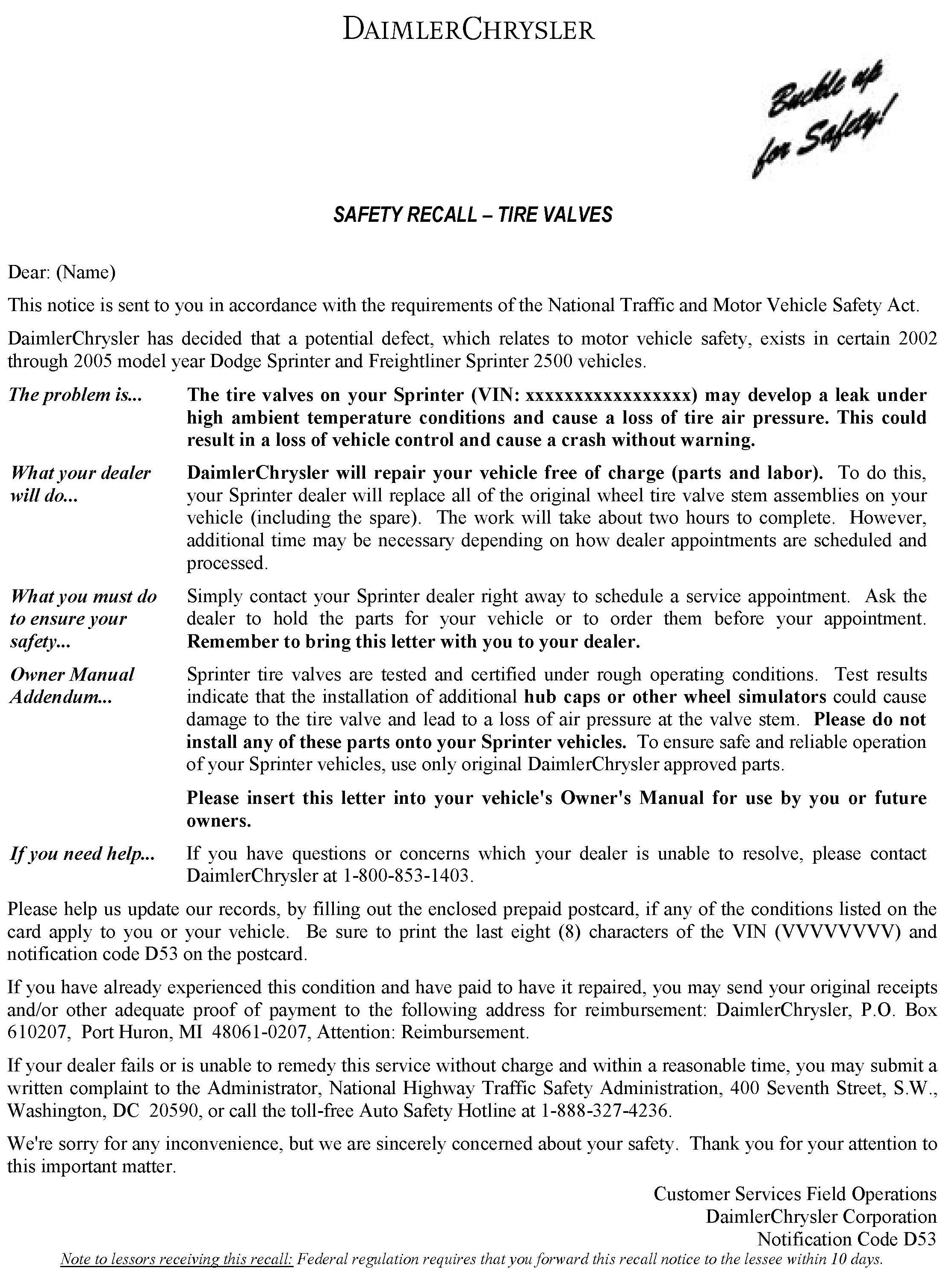 Recall D53 - Tire Valve Stem Replacement