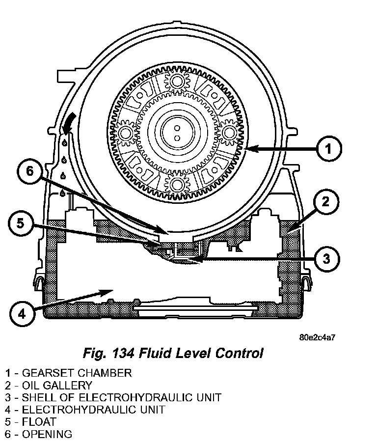 The oil level control (Fig. 134) is located on the electrohydraulic unit and consists of the float (5) which is integrated into the electrohydraulic unit. The float is positioned to plug the opening between the oil gallery and gear set chamber so that the rotating gear sets do not splash about in oil as the oil level rises. The oil level control reduces power loss and prevents oil from being thrown out of the transmission housing at high oil temperatures.