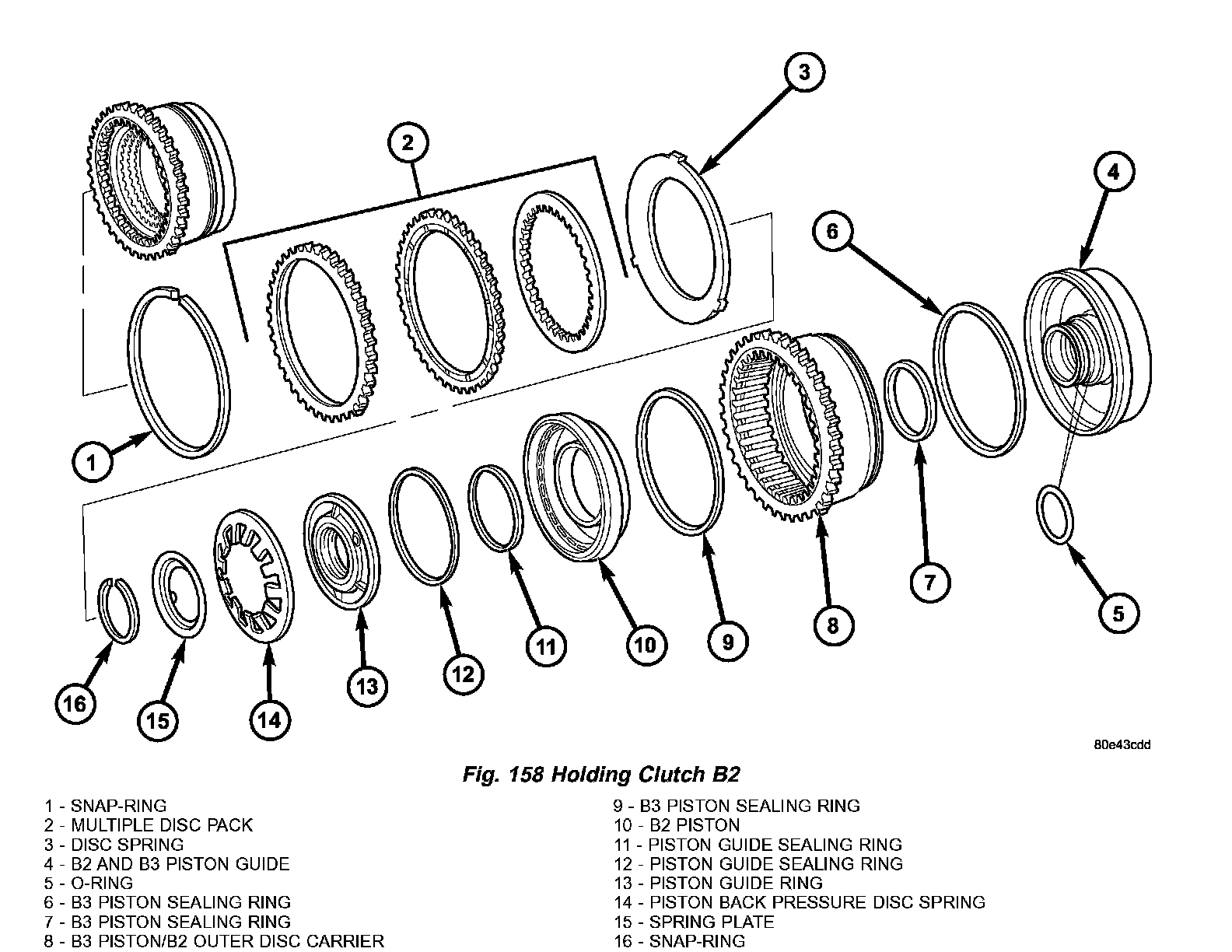 2. Take multiple-disc pack B2 (2) and disc spring (3) out of the outer multiple-disc carrier B2 (8). The outer multiple-disc carrier for the multi-disc holding clutch B2 is the piston for the multiple-disc holding clutch B3 at the same time.