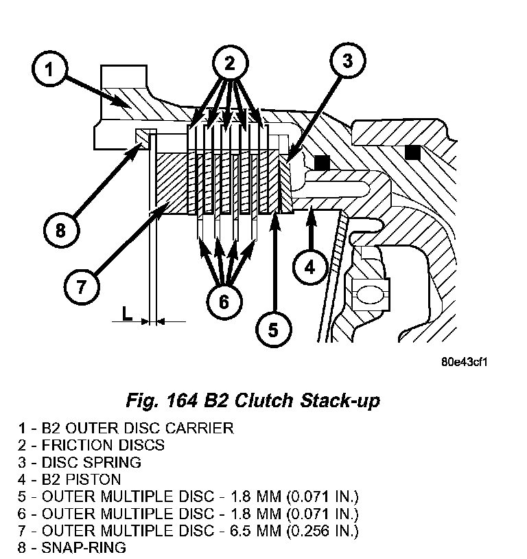 c. Using a feeler gauge, determine the play "L" (Fig. 164) at three points between the snap-ring (8) and outer multiple-disc (7).