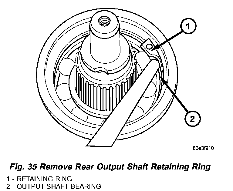 12. Remove the transmission rear output shaft bearing retaining ring (1) (Fig. 35).