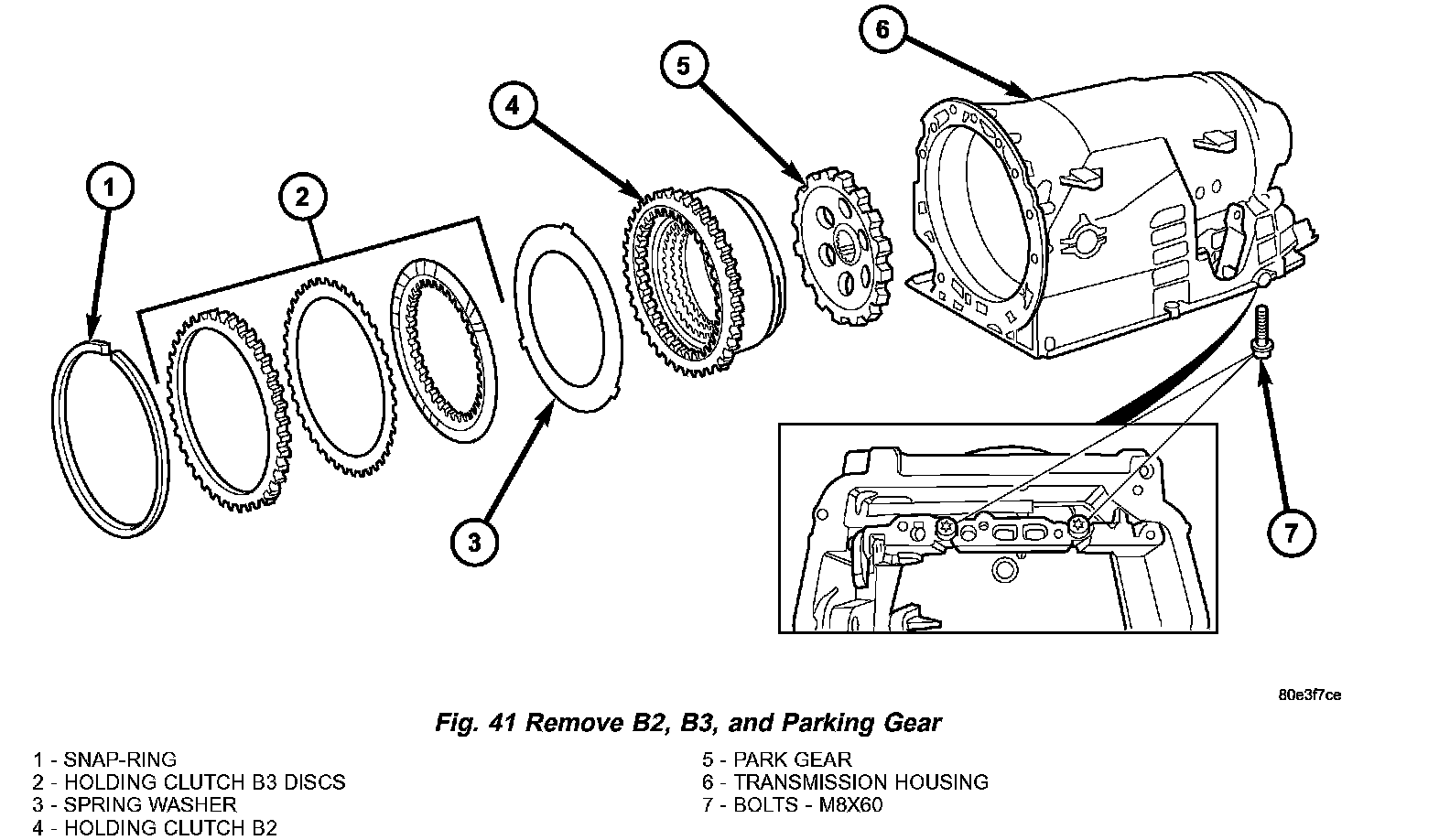31. Remove multiple-disc brake B2 (4) (Fig. 41) from transmission housing. The externally toothed disc carrier for multiple-disc holding clutch B2 is also the piston for multiple-disc holding clutch B3.