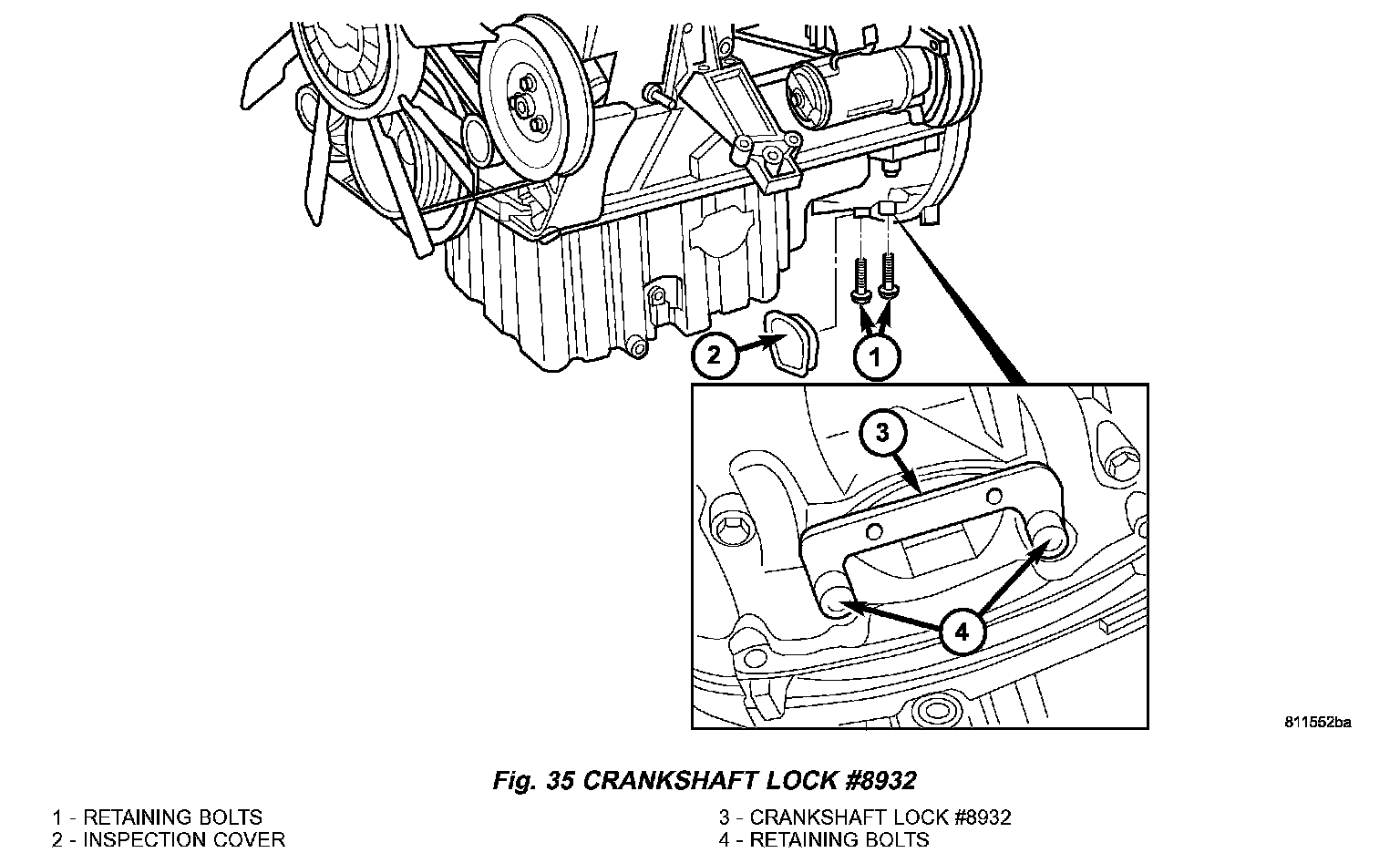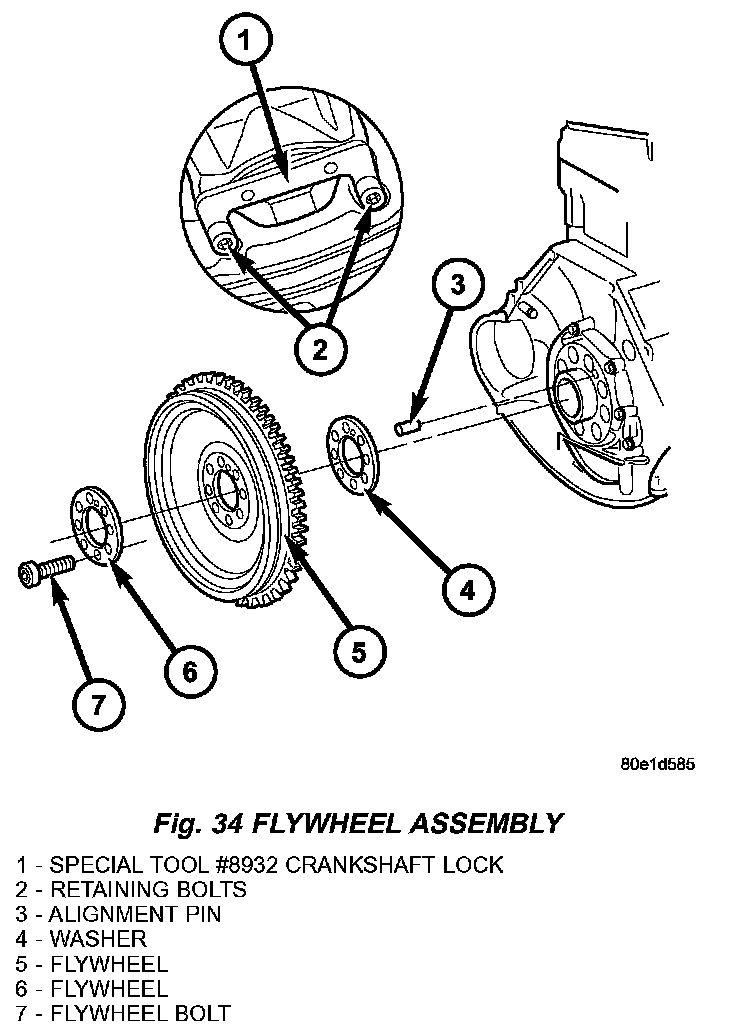 5. Insert the crankshaft lock #8932 into the starter ring gear and install the retaining bolts. Tighten the lock bolts to 9 Nm (80 inch lbs.) (Fig. 35).