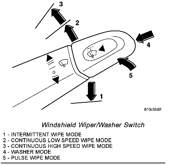 The vehicle operator initiates all wiper and washer system functions with the multi-function switch wiper control stalk that extends from the right side of the steering column, just below the steering wheel. Depressing, raising, or pulling the right control stalk of the multi-function switch selects the desired wiper system operating mode. The wiper system allows the vehicle operator to select from two continuous wiper speeds, Hi or Lo, a fixed interval intermittent wipe mode, and a pulse wipe mode. Pushing the knob on the end of the control stalk towards the steering column activates the washer pump/motor, which dispenses washer fluid onto the windshield glass through the washer nozzles.