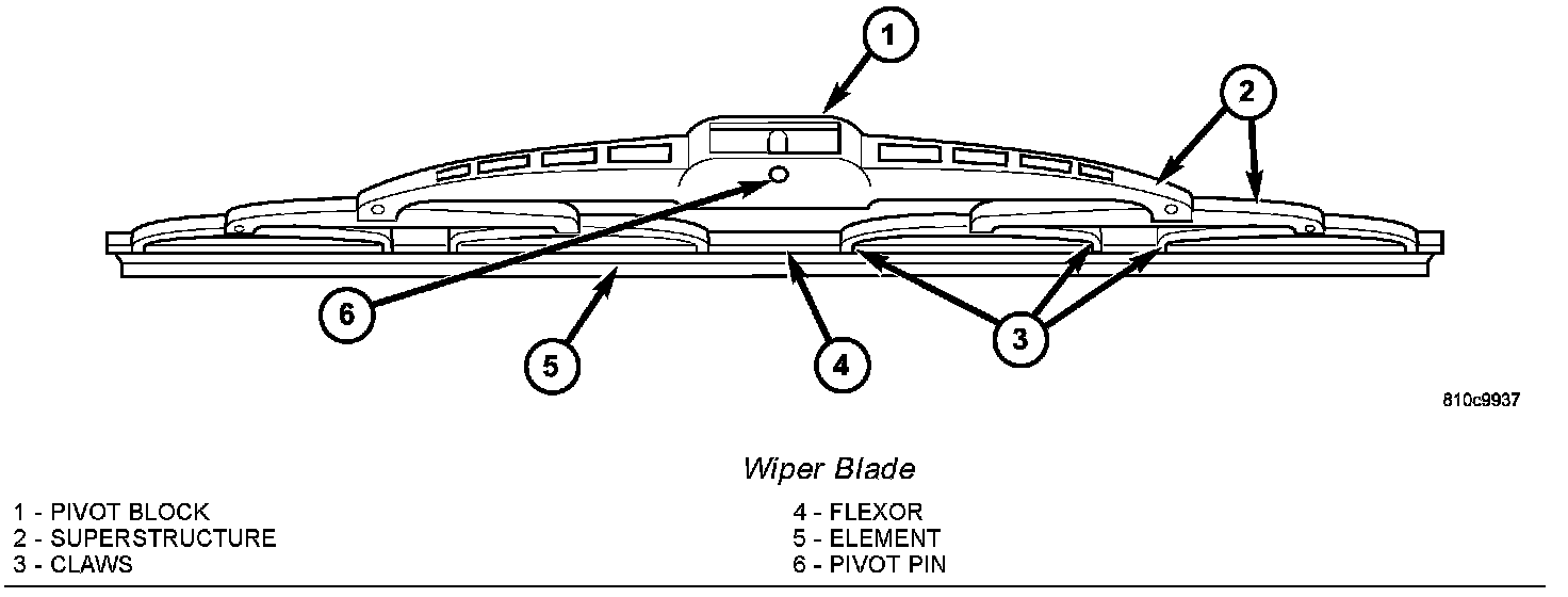 The wiper blades are moved back and forth across the glass by the wiper arms when the wipers are being operated. The wiper blade superstructure is the flexible frame that grips the wiper blade element and evenly distributes the force of the spring-loaded wiper arm along the length of the element. The combination of the wiper arm force and the flexibility of the superstructure makes the element conform to and maintain proper contact with the glass, even as the blade is moved over the varied curvature that may be encountered across the glass surface. The wiper element flexor provides the claws of the blade superstructure with a rigid, yet flexible component on the element which can be gripped. The rubber element is designed to be stiff enough to maintain an even cleaning edge as it is drawn across the glass, but resilient enough to conform to the glass surface and flip from one cleaning edge to the other each time the wiper blade changes directions.