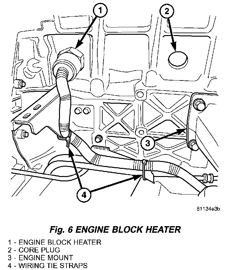 4. Unscrew the engine block heater from the core plug hole and remove (Fig. 6).