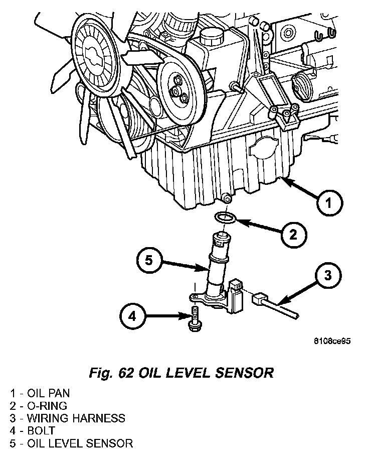 2. Install the oil level sensor into the oil pan and tighten screw to 124 inch lbs.(14 Nm) (Fig. 62).