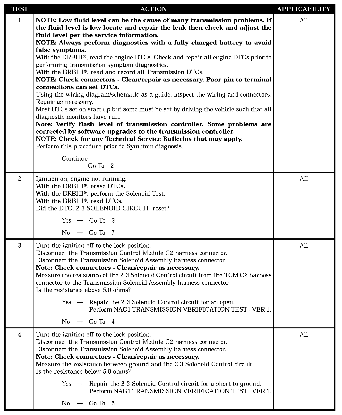 Test Note: All symptoms listed above are diagnosed using the same tests. The title for the tests will be 2 3 SOLENOID CIRCUIT.