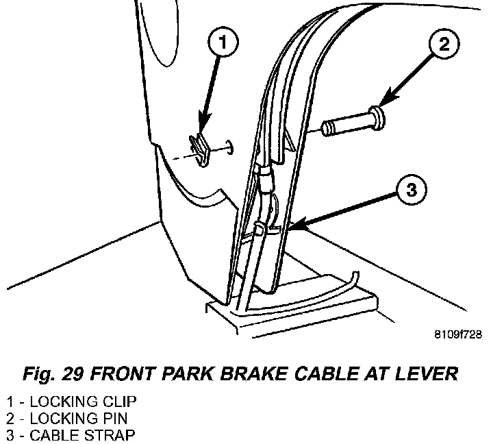 3. Remove the front park brake cable from the hand brake lever (Fig. 29).