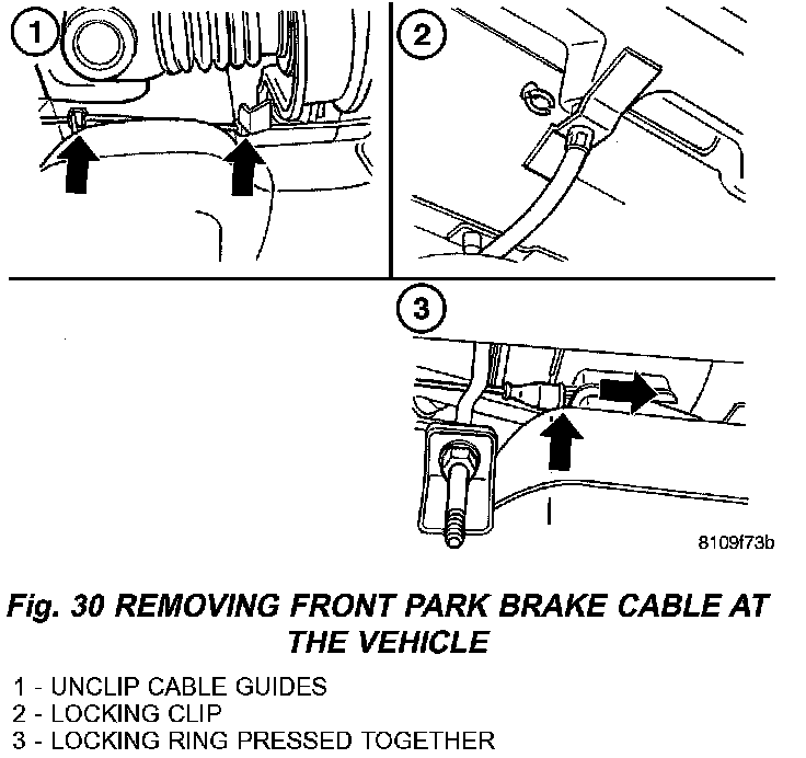 4. Unclip the guides at the frame cross members for the front cable at the vehicle (Fig. 30).
