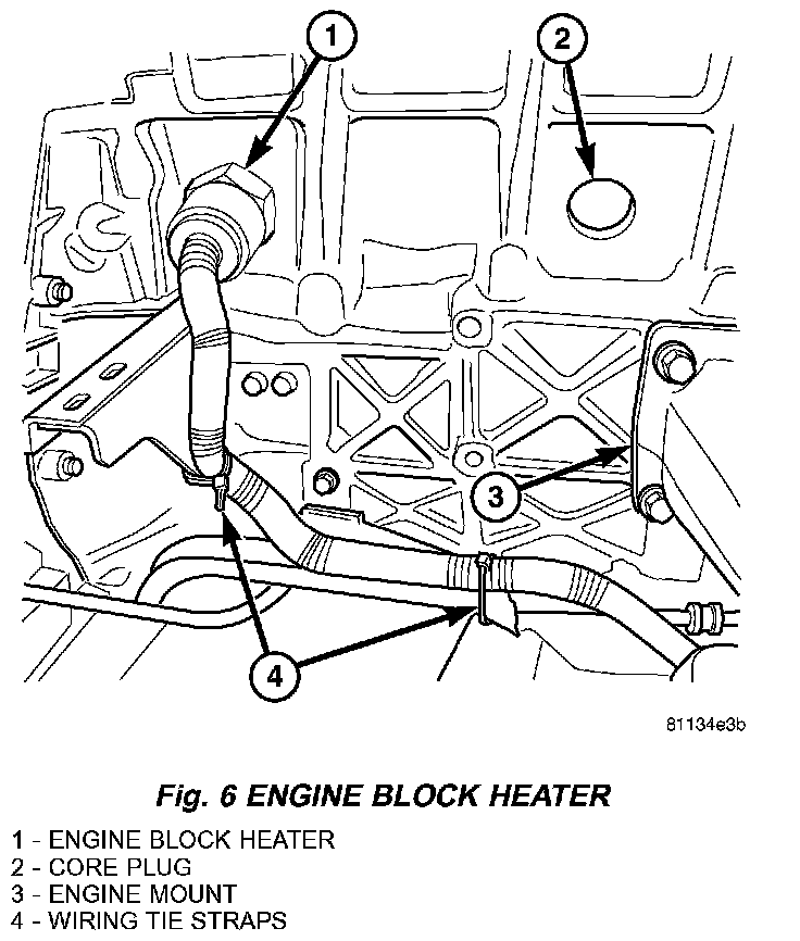 4. Unscrew the engine block heater from the core plug hole and remove (Fig. 6).