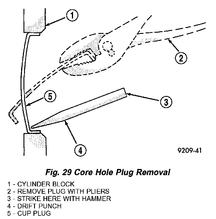 STANDARD PROCEDURE - REPLACING ENGINE CORE AND OIL GALLERY PLUGSUsing a blunt tool such as a drift and a hammer, strike the bottom edge of the cup plug. With the cup plug rotated, grasp firmly with pliers or other suitable tool and remove plug (Fig. 29).