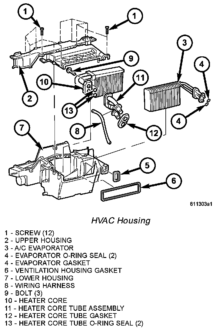 1. Install the A/C evaporator into the lower half of the HVAC housing.