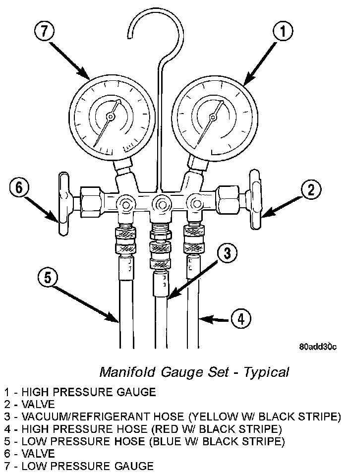 A manifold gauge set may be needed with some recovery/recycling/charging equipment. The service hoses on the gauge set being used should have manual (turn wheel), or automatic back-flow valves at the service port connector ends. This will prevent refrigerant from being released into the atmosphere.