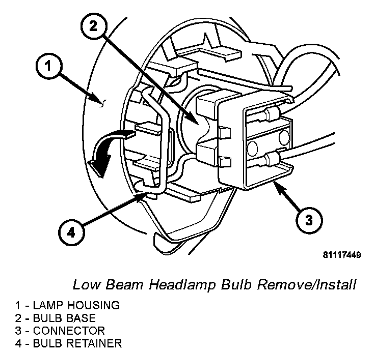 1. Position the low beam headlamp bulb into the integral bulb holder on the front lamp unit reflector.