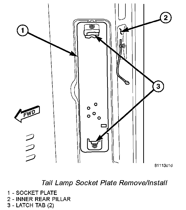 3. From inside the vehicle, use hand pressure to push the two latch tabs toward the center of the tail lamp unit socket plate and pull the socket plate straight out from the inner rear pillar.