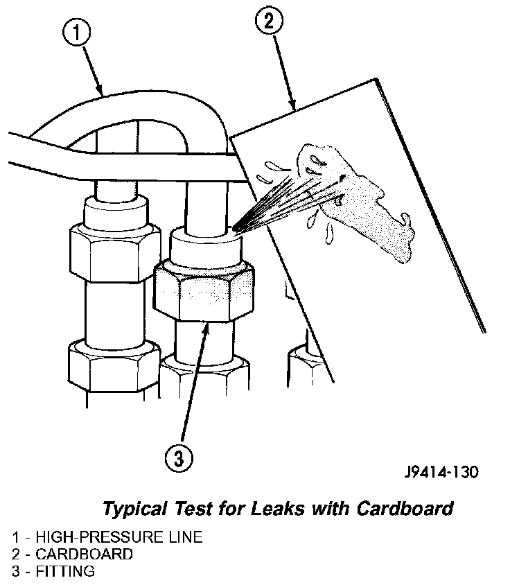 WARNING: HIGH-PRESSURE FUEL LINES DELIVER FUEL UNDER EXTREME PRESSURE FROM THE INJECTION PUMP TO THE INJECTORS. THIS MAYBE AS HIGH AS I6OOBAR (23,200PS1). USE EXTREME CAUTION WHEN INSPECTING FOR HIGH-PRESSURE FUEL LEAKS. FUEL UNDER THIS AMOUNT OF PRESSURE CAN PENETRATE SKIN CAUSING PERSONAL INJURY OR DEATH. INSPECT FOR HIGH-PRESSURE FUEL LEAKS WITH A SHEET OF CARDBOARD PLACED IN THE SUSPECTED AREA WHILE THE ENGINE IS NOT RUNNING. START THE VEHICLE AND ALLOW THE ENGINE TO RUN FOR A SHORT PERIOD. TURN THE ENGINE OFF AND INSPECT THE PIECE OF CARDBOARD. WEAR SAFETY GOGGLES AND ADEQUATE PROTECTIVE CLOTHING WHEN SERVICING FUEL SYSTEM.High-pressure fuel line leaks can cause starting problems and poor engine performance.