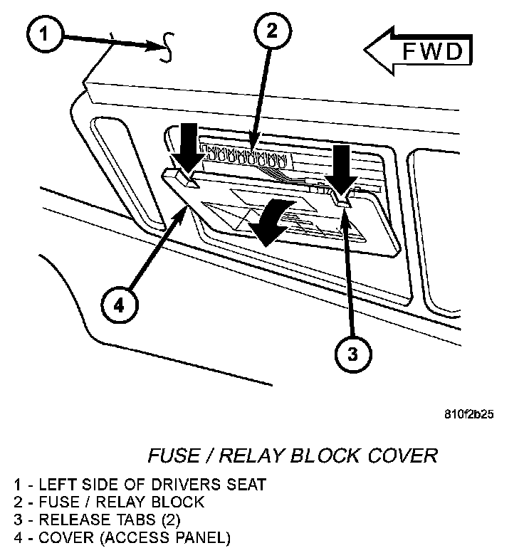 1. Remove Fuse/Relay Block cover by pushing down on two tabs located at top of cover.