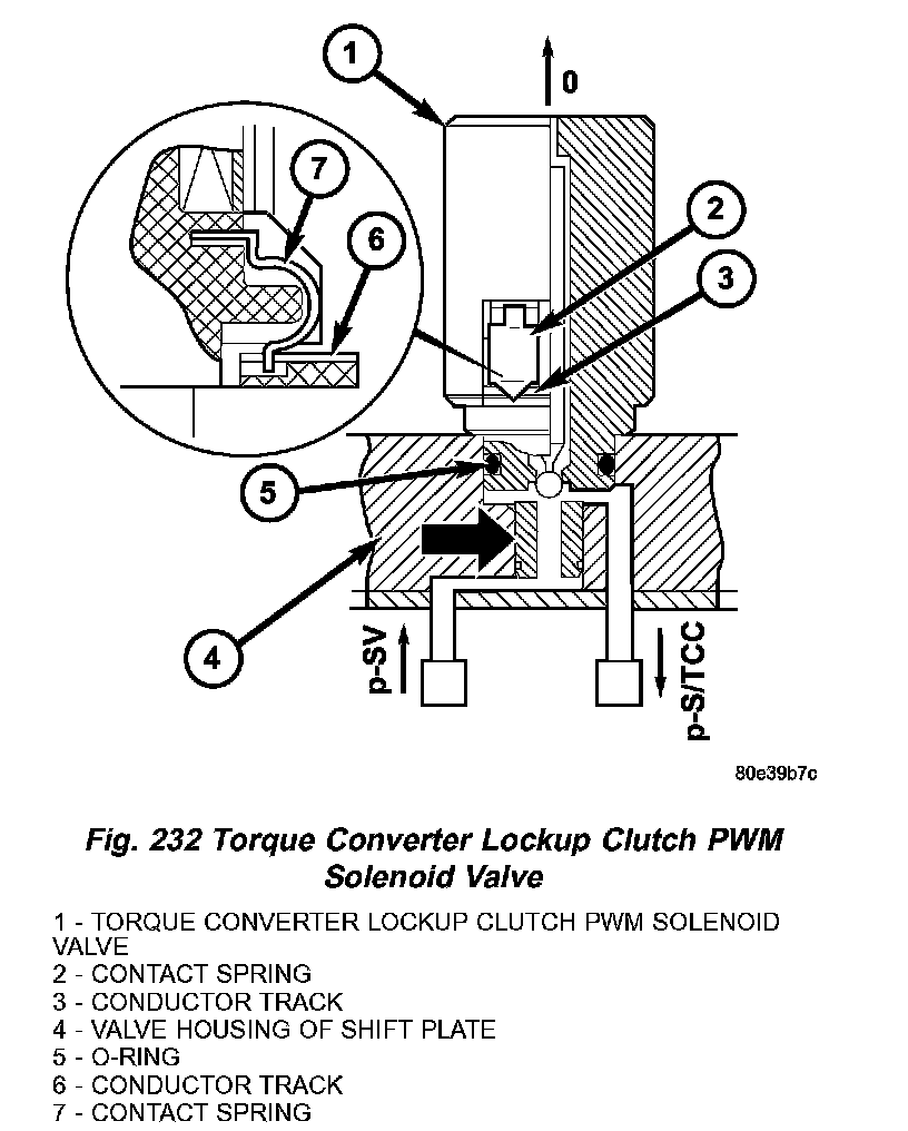 The torque converter lockup PWM solenoid (1) (Fig. 232) valve converts pulse wave modulated current controlled by the TCM into the appropriate hydraulic control pressure (p-S/TCC).