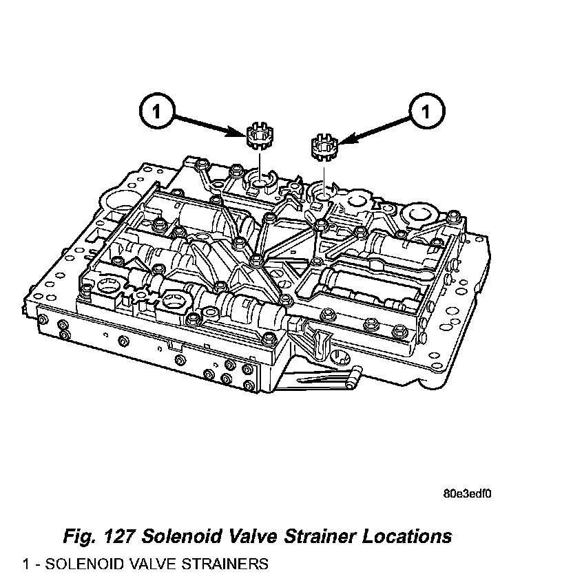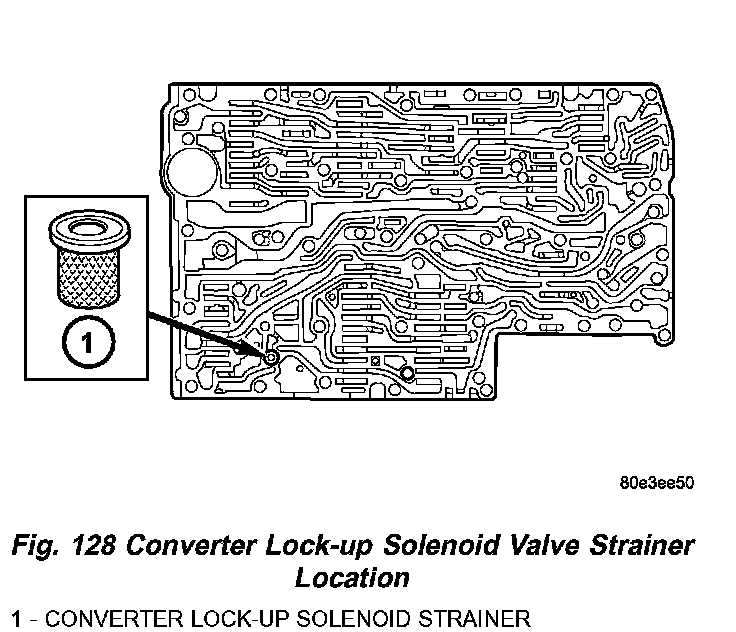 14. Remove the strainer (1) (Fig. 128) in the inlet to torque converter lock up control solenoid valve.