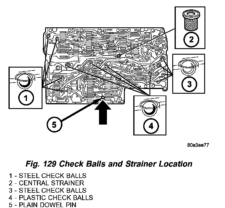 15. Note the location of all check balls (1, 3, 4) (Fig. 129) and the central strainer (2) for re installation. Remove all check balls (1, 3, 4) and the central strainer (2).
