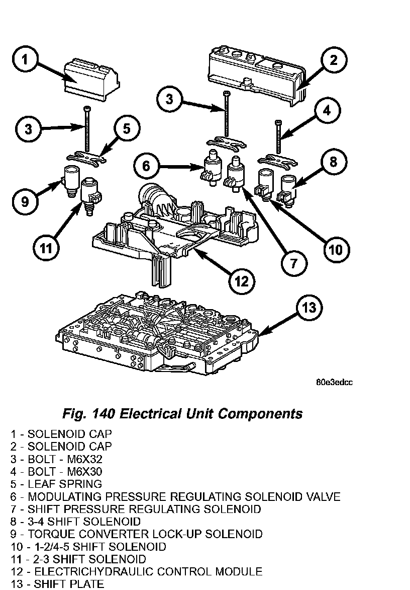 13. Install the electrohydraulic control module (12) onto the shift plate (13) (Fig. 140).