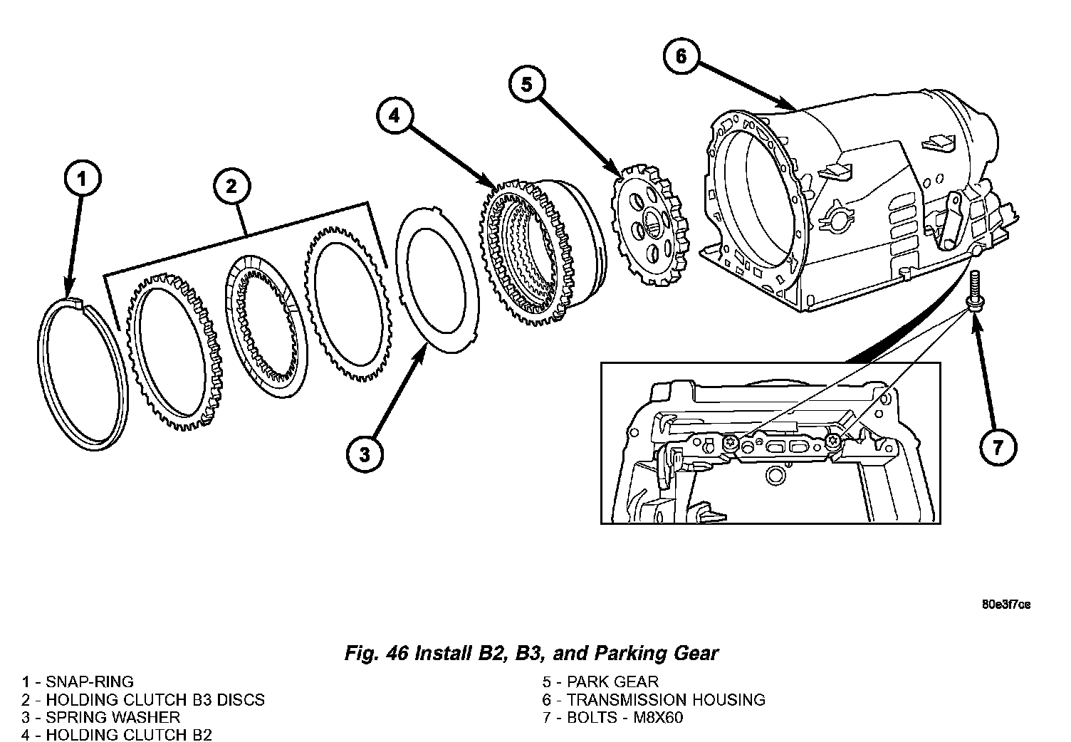 2. Install multiple disc holding clutch B2 (4) in transmission housing (6) (Fig. 46).
