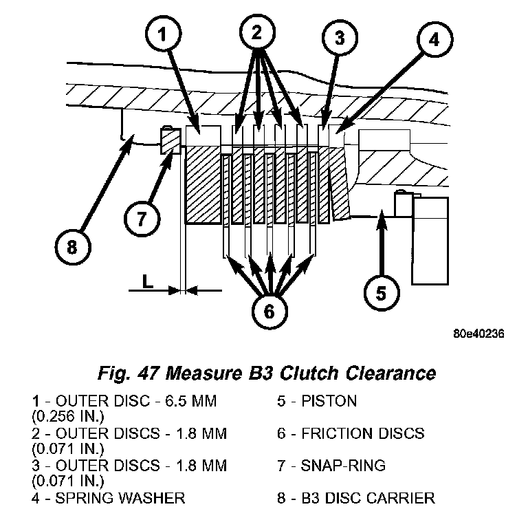 b. Using a feeler gauge, determine the play "L" at three points between the snap ring (7) and outer multiple disc (1). B3 clutch clearance should be 1.01.4 mm (0.039 - 0.055 inch). Adjust the clearance as necessary.