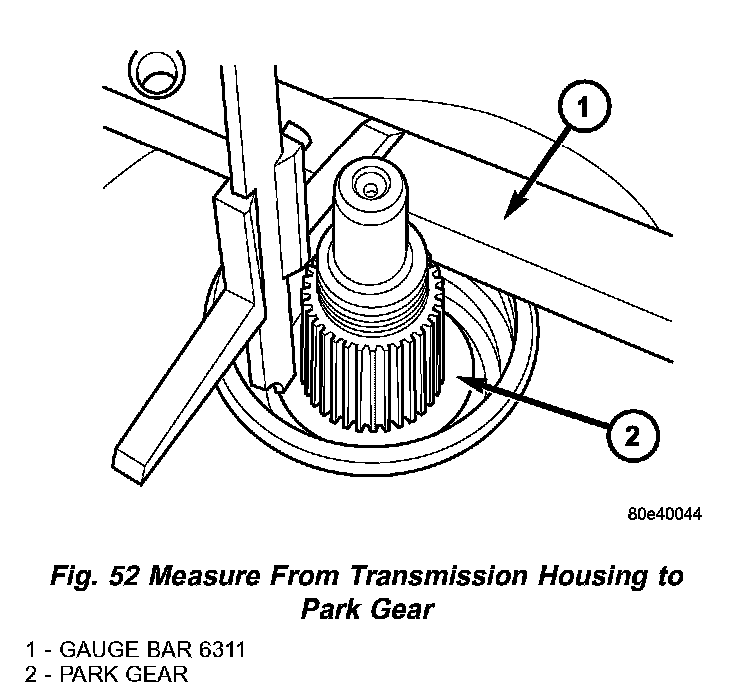 22. Place Gauge Bar 6311 (1) on transmission housing. Using a depth gauge, measure from the gauge bar (1) to the parking lock gear (2) (Fig. 52).