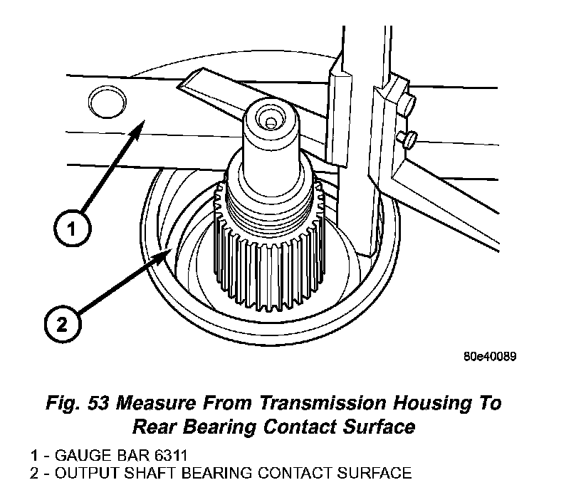 23. Using a depth gauge, measure from the Gauge Bar 6311 (1) to the contact surface of the output shaft bearing (2) in the transmission housing. (Fig. 53)