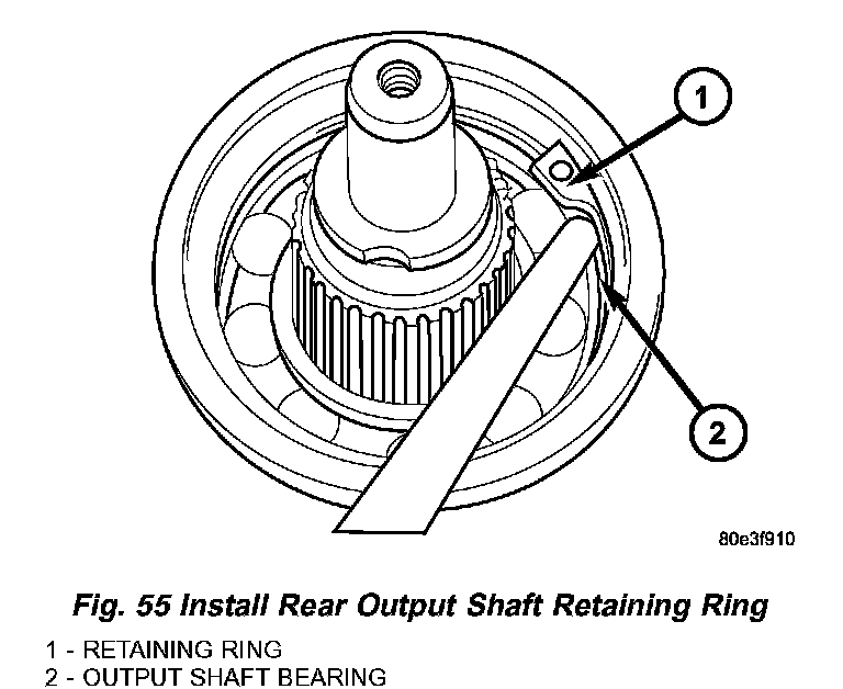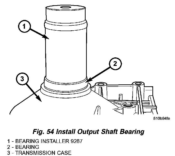 27. Install output shaft bearing (2) in rear transmission housing. Using Bearing Installer 9287 (1) (Fig. 54), install the output shaft bearing (2) into the transmission housing. The closed side of the plastic cage must point towards the parking lock gear.