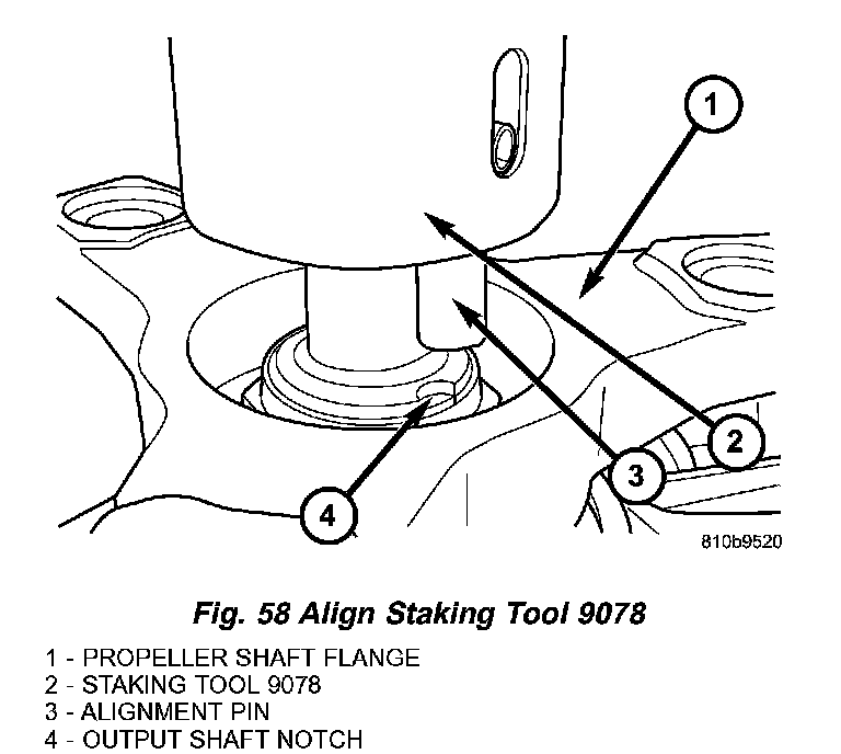 38. Rotate the Staking Tool 9078 (2) until the alignment pin (3) engages the output shaft notch (4) (Fig. 58).