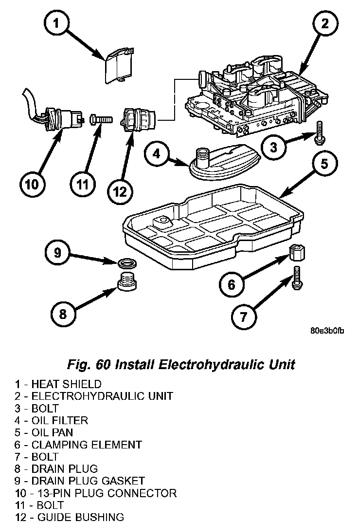 43. Install oil pan (5) (Fig. 60). Tighten the bolts to 8 Nm (71 inch lbs.).
