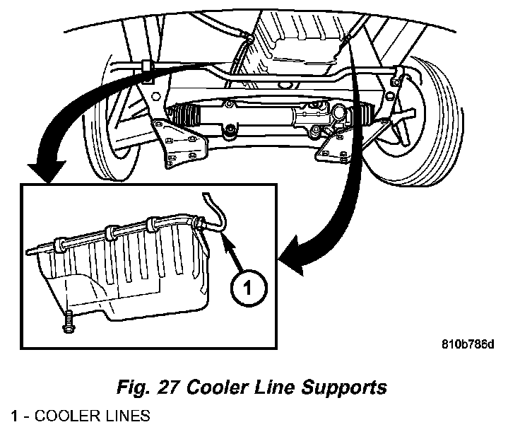 a. Remove bracket for the oil cooler feed and return lines (1) (Fig. 27) from engine oil pan flange. Detail shows right side of motor. Position is mirrored for the left side of engine.