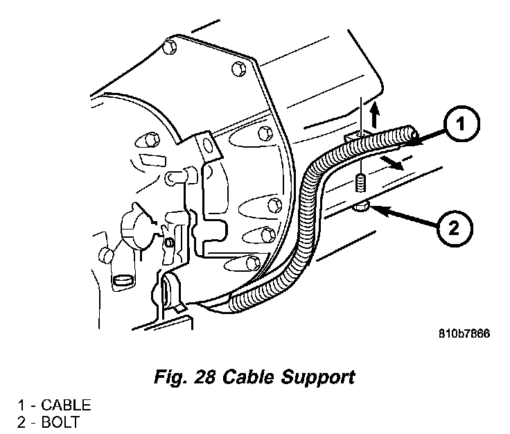 b. Detach bracket of cable retainer (4) (Fig. 28) from the threaded shank of a engine oil pan bolt (5).