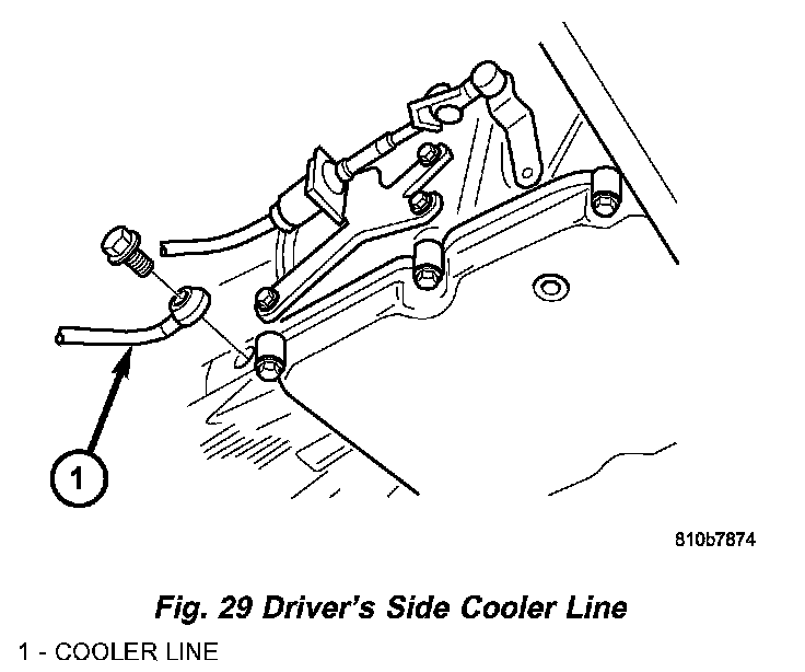 d. Remove the bolts holding the oil cooler lines (6) (Fig. 29) to the left and right sides of transmission and hang the lines to the side.