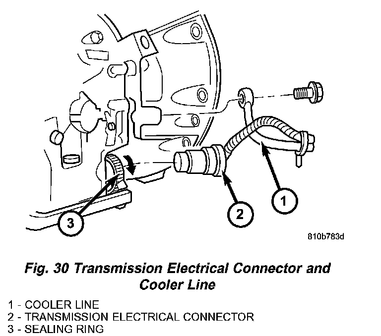 10. Disconnect the transmission electrical connector (2) (Fig. 30) from transmission and hang to the side. Turn sealing ring (3) counterclockwise and disconnect plug connection (2).