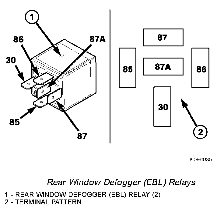 - The coil battery terminal (85) receives a battery current input from the rear window defogger module when the rear window defogger switch is energized.
