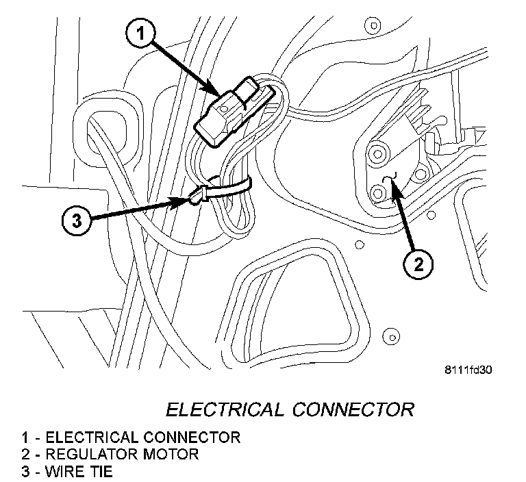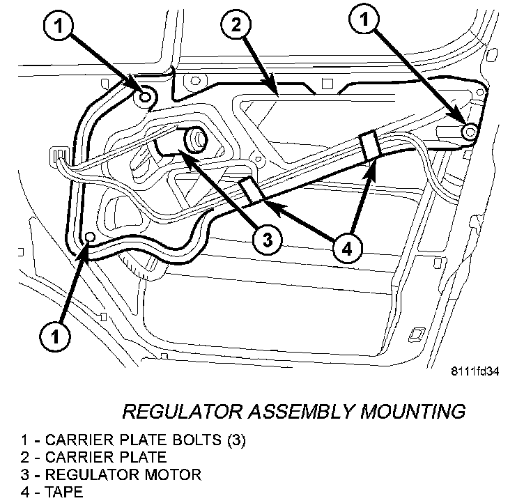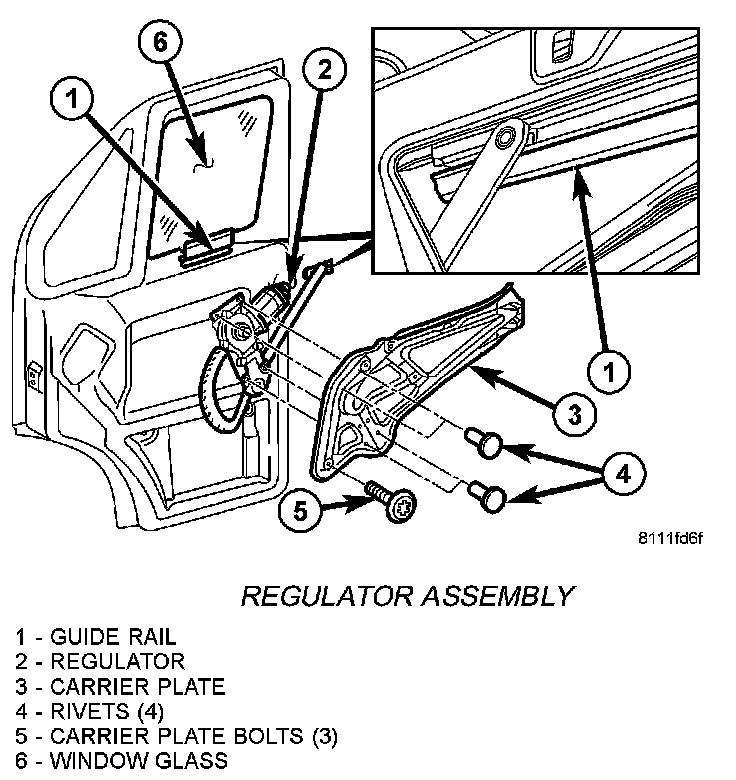 2. Install regulator lift arm into glass guide rail and install regulator assembly.